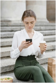 Woman wearing eyeglasses with coffee and smartphon