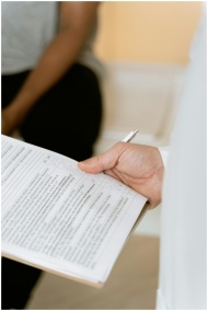 A healthcare professional reviewing a patient's medical chart during a consultation.