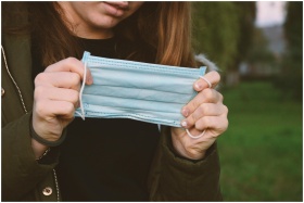 A woman outdoors holding a face mask, representing pandemic protection.