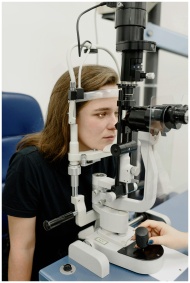 A young woman receives an eye examination using mo