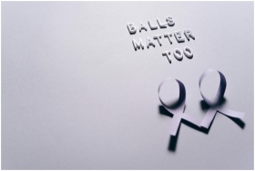 Promoting awareness for testicular cancer with symbolic ribbons on a light grey background.