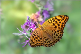 Close-up of an orange butterfly on a purple flower, showcasing natural beauty and vivid colors.