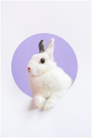 Close-up of a cute white rabbit in a circular cutout against a purple backdrop.