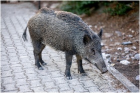 A wild boar walks along a pavement edge, showcasin