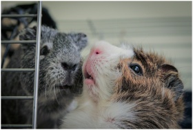 Close-up photo capturing the cute details of two fluffy guinea pigs peeking through a cage.