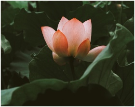 A serene image of a pink lotus flower against a backdrop of lush green leaves, capturing nature's tranquility.