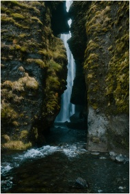 Captivating view of a secluded waterfall nestled within a moss-covered Icelandic gorge.