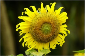 Vibrant yellow sunflower in full bloom on a sunny day, showcasing detailed petals and seeds.