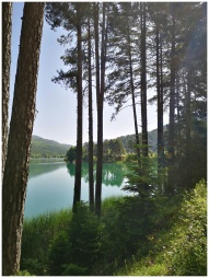 Tranquil forest scene with tall trees around a clear lake on a sunny day.