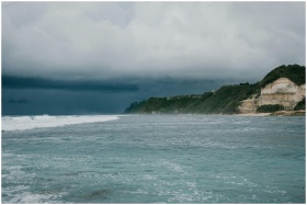 A scenic view of a cloudy coastline with dramatic