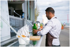 Male vendor prepares drinks at a food truck by the