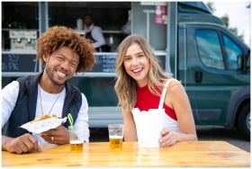Smiling friends enjoying a meal and drinks at an outdoor food truck, sharing joy and leisure time.