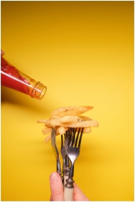 Close-up of fries on forks with ketchup pour again