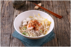 Tasty Asian noodle dish with shrimp, sprouts, and