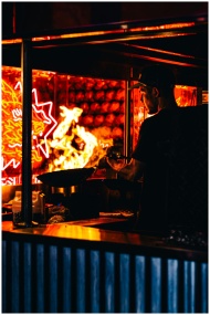 A vibrant scene of a street food vendor cooking in a night market, illuminated by neon lights.