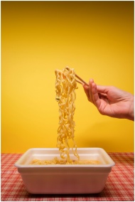Crop anonymous person using bamboo chopsticks while eating traditional instant noodles prepared in container in kitchen