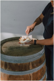 Close-up of a hand spreading cream cheese on a bagel over a wooden barrel.