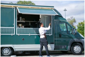 Side view young waiter in apron standing outside food truck and opening counter door in green lush park