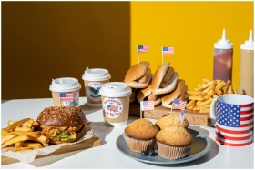 Patriotic themed fast food setup with American fla