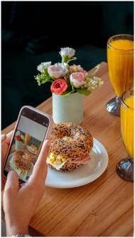 A person photographs a sesame seed bagel with orange juice in a cozy café.