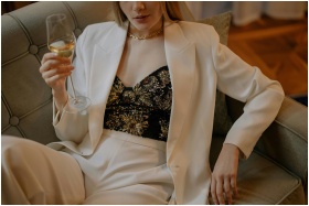 Stylish woman in a white suit sipping wine while r