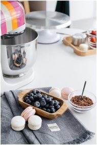 A stylish indoor baking setup featuring blueberries, macarons, and a mixer, perfect for food photography.