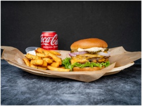 Mouth-watering cheeseburger with crispy fries and a can of Coca-Cola, perfect fast food meal.