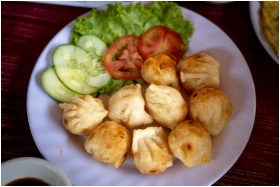 Close-up of fried dumplings served with fresh cucu