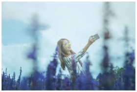 A smiling young woman takes a selfie amidst vibrant lavender blooms on a sunny day.