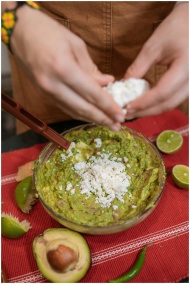 Close-up of fresh homemade guacamole with feta che