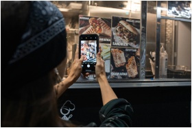 Photograph of a person taking a picture of a street food menu at night.
