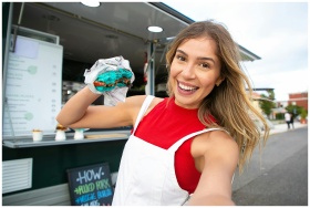 Smiling female in casual clothes standing with blue burger and taking selfie on street against food truck in daytime