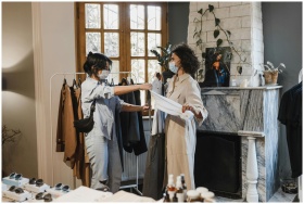 Two women wearing masks shopping in a boutique during the COVID-19 pandemic.
