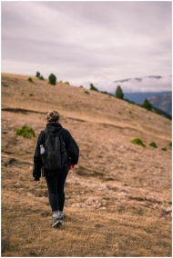 A woman in black hiking gear climbs a hillside in Vallcebre, Spain. Outdoor adventure.
