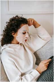Side view of focused female with curly hair wearing sheet mask surfing cellphone while sitting couch with hand on forehead