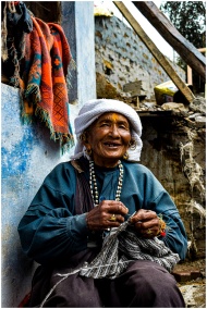 Smiling elderly woman knitting outside a rustic building, showcasing cultural fashion.