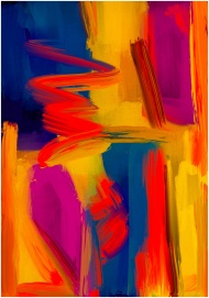 Dynamic and colorful expressionist artwork with bold brush strokes in red, blue, and yellow hues.