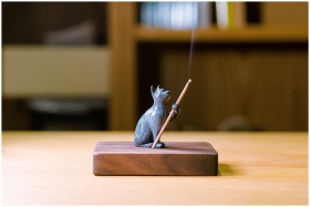 Elegant cat figurine incense holder with gentle smoke trail on wooden base.