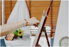Close-up of an artist painting on canvas with an easel and vibrant bracelet in a studio setting.