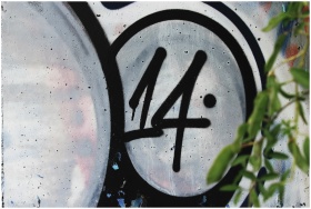 A detailed view of graffiti art featuring the number 14, with green leaves in the foreground.