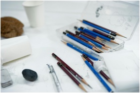 A collection of sketching tools and art supplies a