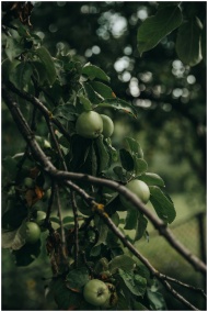 Close-up of fresh green apples hanging on tree branches with lush leaves in a summer garden.