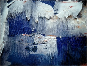Intricate abstract artwork featuring blue and white texture resembling crystallization.