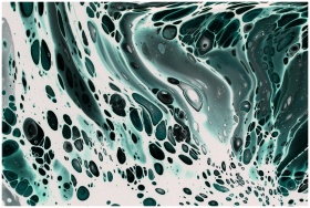 Abstract fluid art with swirling teal and black patterns creates a mesmerizing texture.