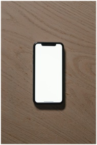 Vertical shot of a smartphone with a blank screen on a wooden surface, ideal for mockup use.