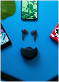 Flat lay of wireless headphones and smartphones on