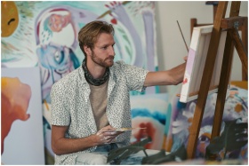 Bearded male artist painting on canvas in a vibrant studio setting, surrounded by artwork.