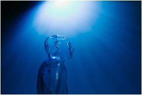 Transparent robotic figure illuminated by blue light, symbolizing AI and futuristic technology.
