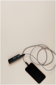 Overhead shot of a smartphone charging with a power bank on a plain background.