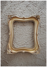 Antique golden frame with ornate details against a textured gray wall, perfect for art and design themes.